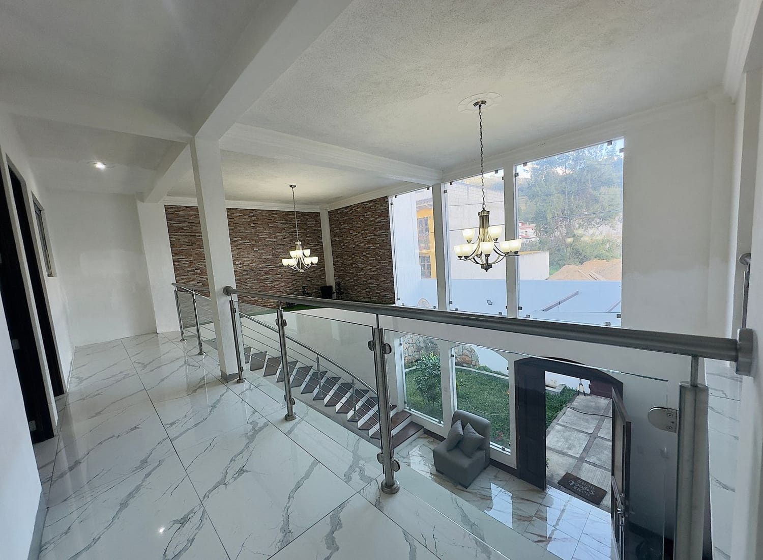 Sala de doble altura con baranda de acero inoxidable y vidrio